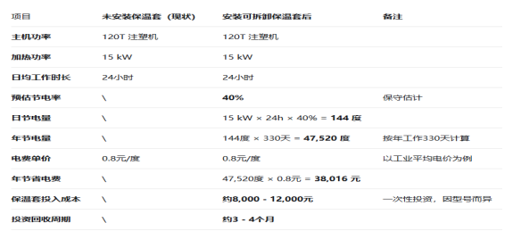 讓我們通過一個簡單的例子來算一筆賬:某 120T 注塑機,加熱功率 15kW,日均工作 24 小時。未安裝保溫套時無節(jié)電效果,安裝可拆卸保溫套后預估節(jié)電率 40%,日節(jié)電量 144 度,年節(jié)電量 47520 度,年節(jié)省電費 38016 元;保溫套投入成本約 8000-12000 元,投資回收周期約 3-4 個月。